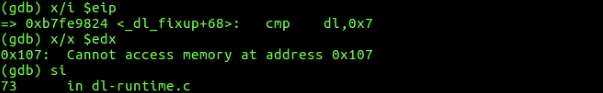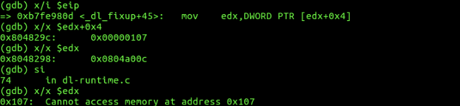 그리고 edx 레지스터에 담겨 있던 .dynsym에서의 index 값과 재배치 타입 값을 esi 레지스터에 옮김으로써 esi, edx 모두 0x107이 들어있다.