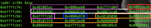 그리고 .dynsym 테이블에서 puts에 해당하는 Elf32_Sym 구조체 형식의 값의 주소(0x80481d)를 esp+0x1c(0xbfffefb4) 주소에 저장해두고
