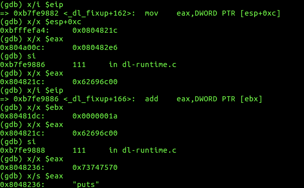 plt(plt+6 : reloc_offset(0x0), plt+11 : jmp 0x80482d0[dynamic linking])