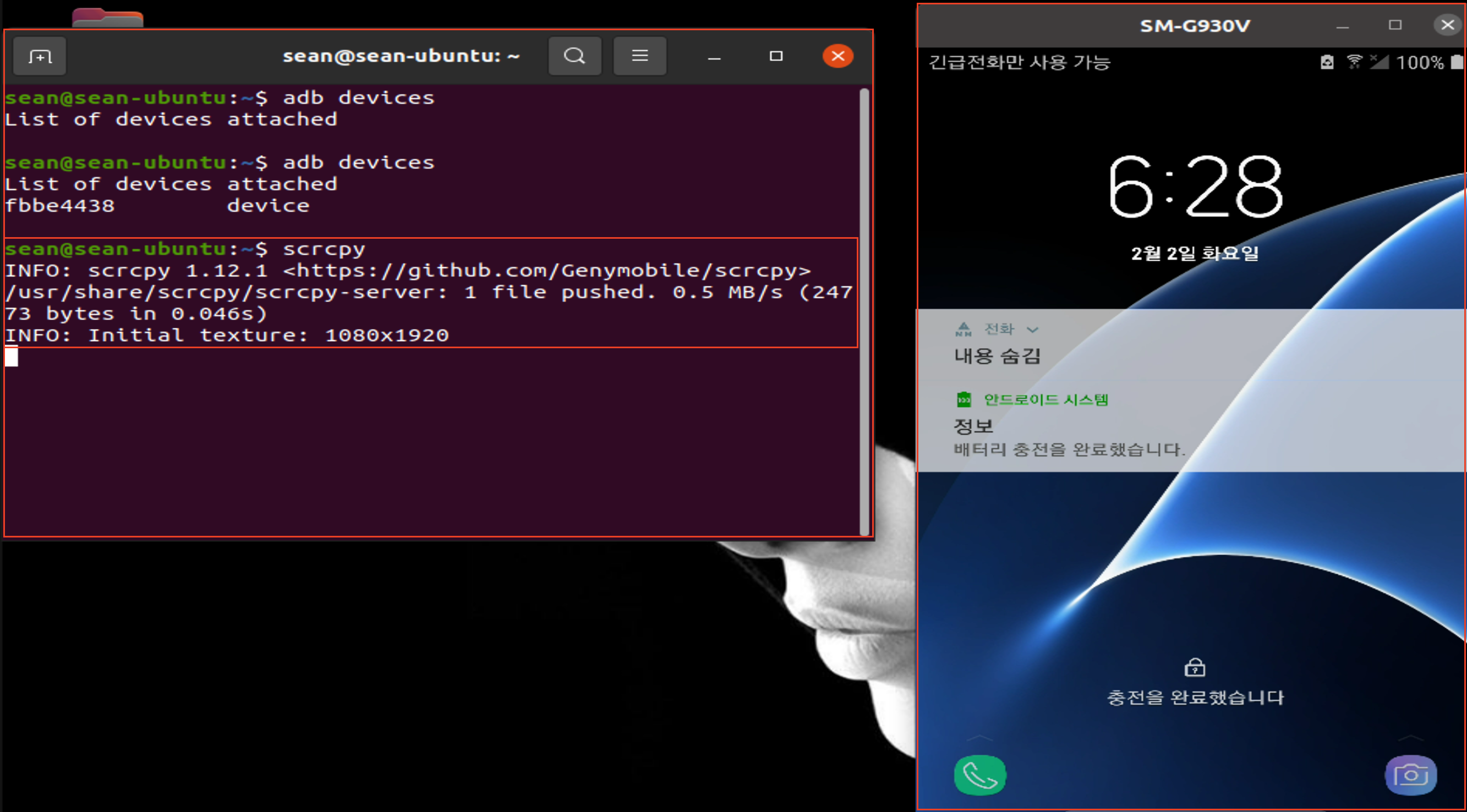 ADB와 scrcpy를 이용하여 안드로이드 스마트폰의 화면이 잘 출력되는지 확인해주면 됩니다.